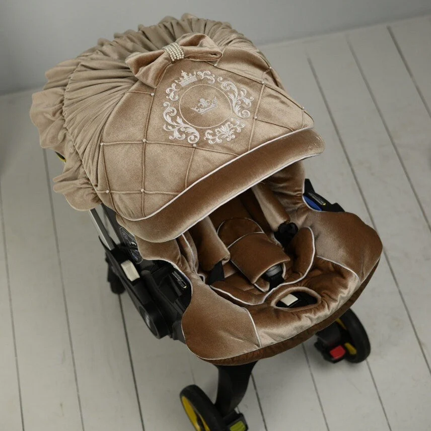 This beige velvet baby car seat cover with rhinestones and pearls is ideal for parents who want a stylish, decorative car seat accessory that combines visual charm with comfortable functionality.