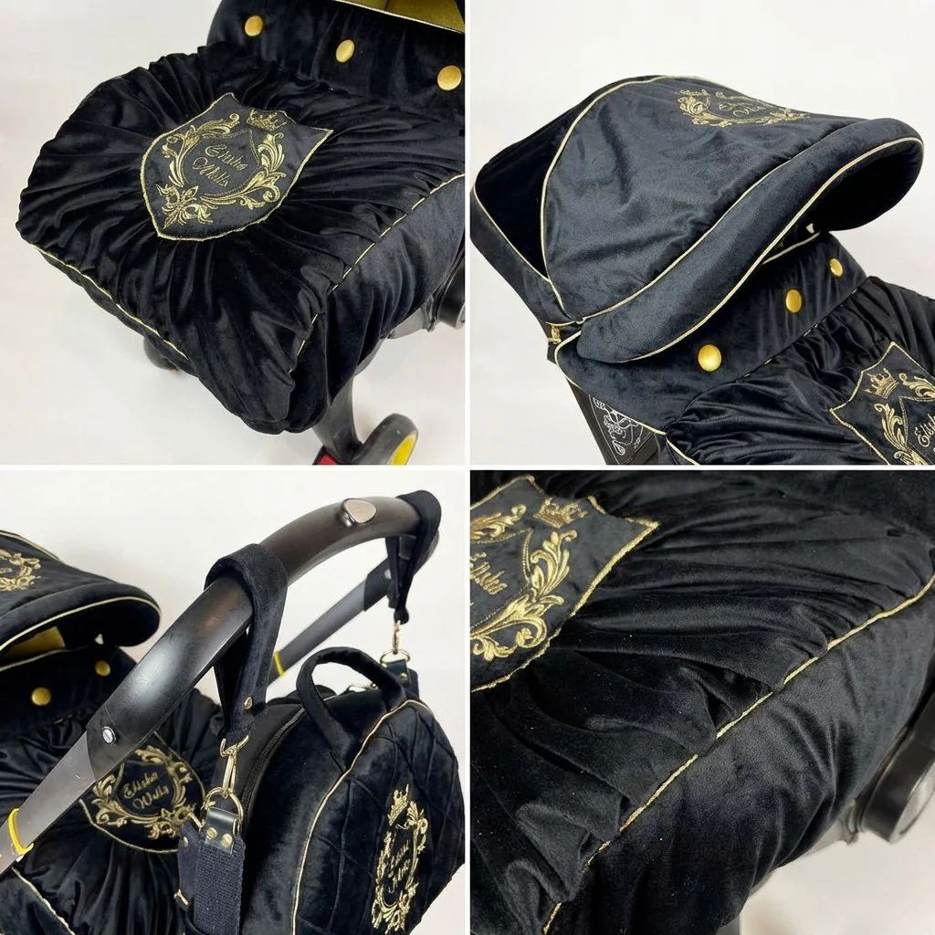 Elevate your baby’s travel experience with this Black & Gold Personalized Doona Car Seat Accessories Set. Designed specifically for infant car seats, this luxury set combines elegant black fabric with refined gold details for a timeless, premium look.