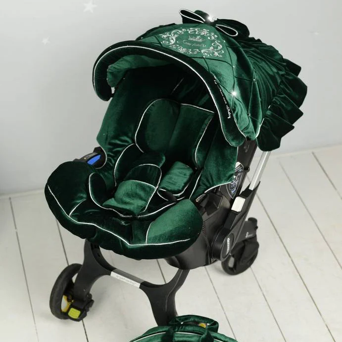 Emerald Green Velvet Infant Car Seat Cover and Accessories Set is a luxury handmade set designed to enhance both comfort and appearance of your baby’s car seat. Crafted from premium velvet fabric, this set combines elegant design, soft padding, and practical functionality for everyday use.