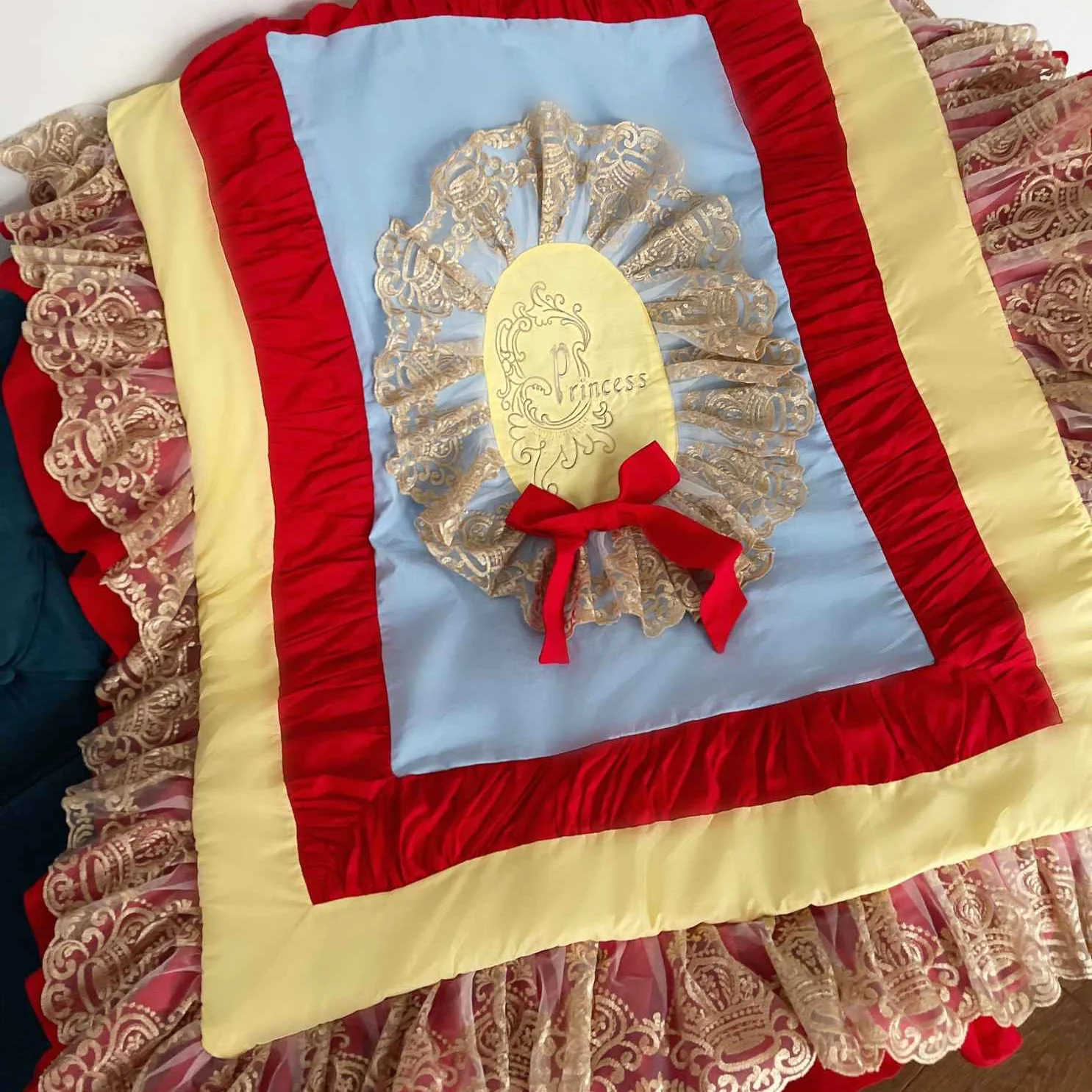 Transform your nursery into a fairytale kingdom with our girl crib bedding set. Inspired by the timeless elegance of Snow White, this luxury set features royal red ruffles, golden yellow accents, and soft blue layers. It is the ultimate choice for parents who want a dramatic, regal look rather than a simple neutral crib bedding set. Give your little princess the storybook start she deserves with high-end fabrics and artisan craftsmanship.