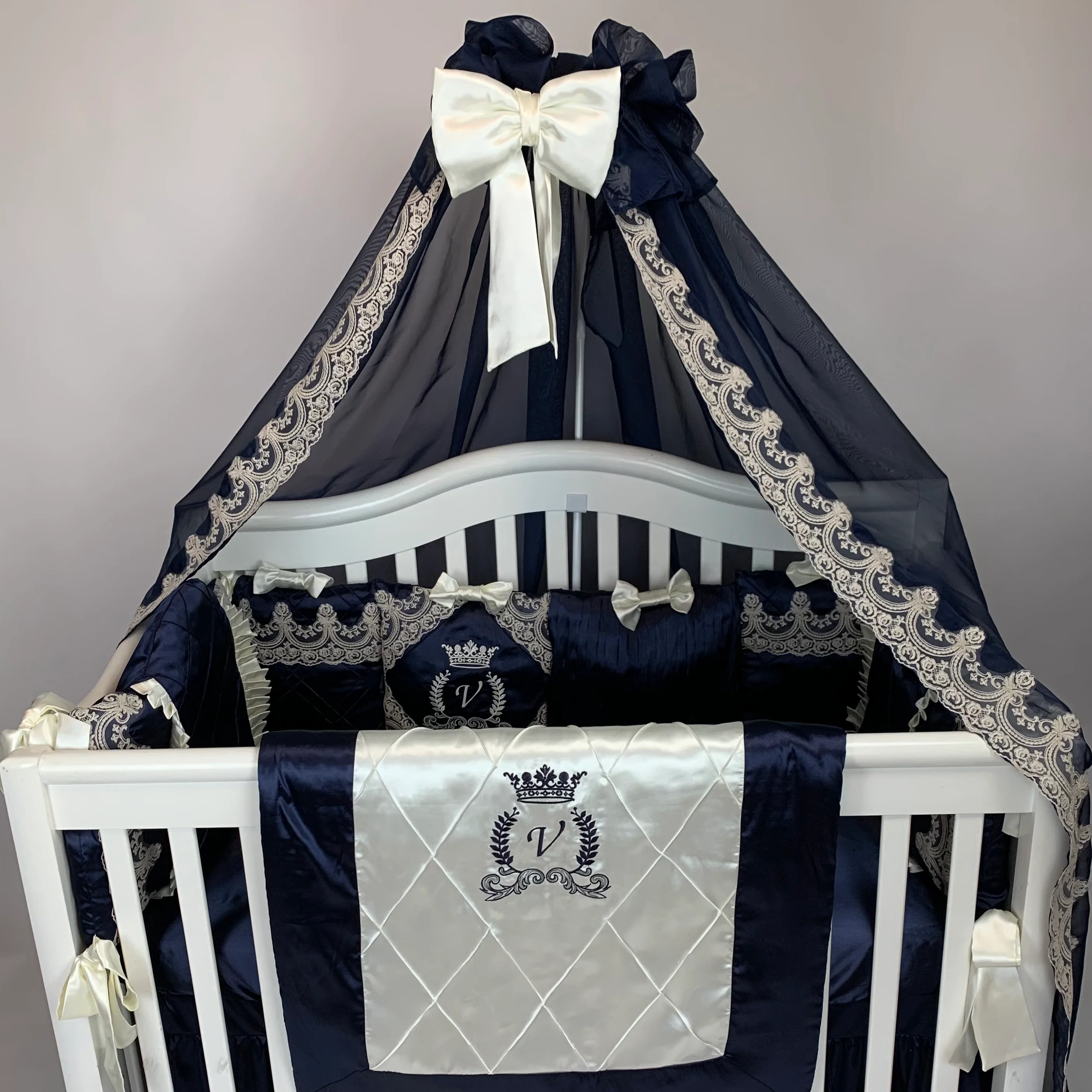 Luxury Royal Blue & Ivory Baby Bedding Set with Canopy