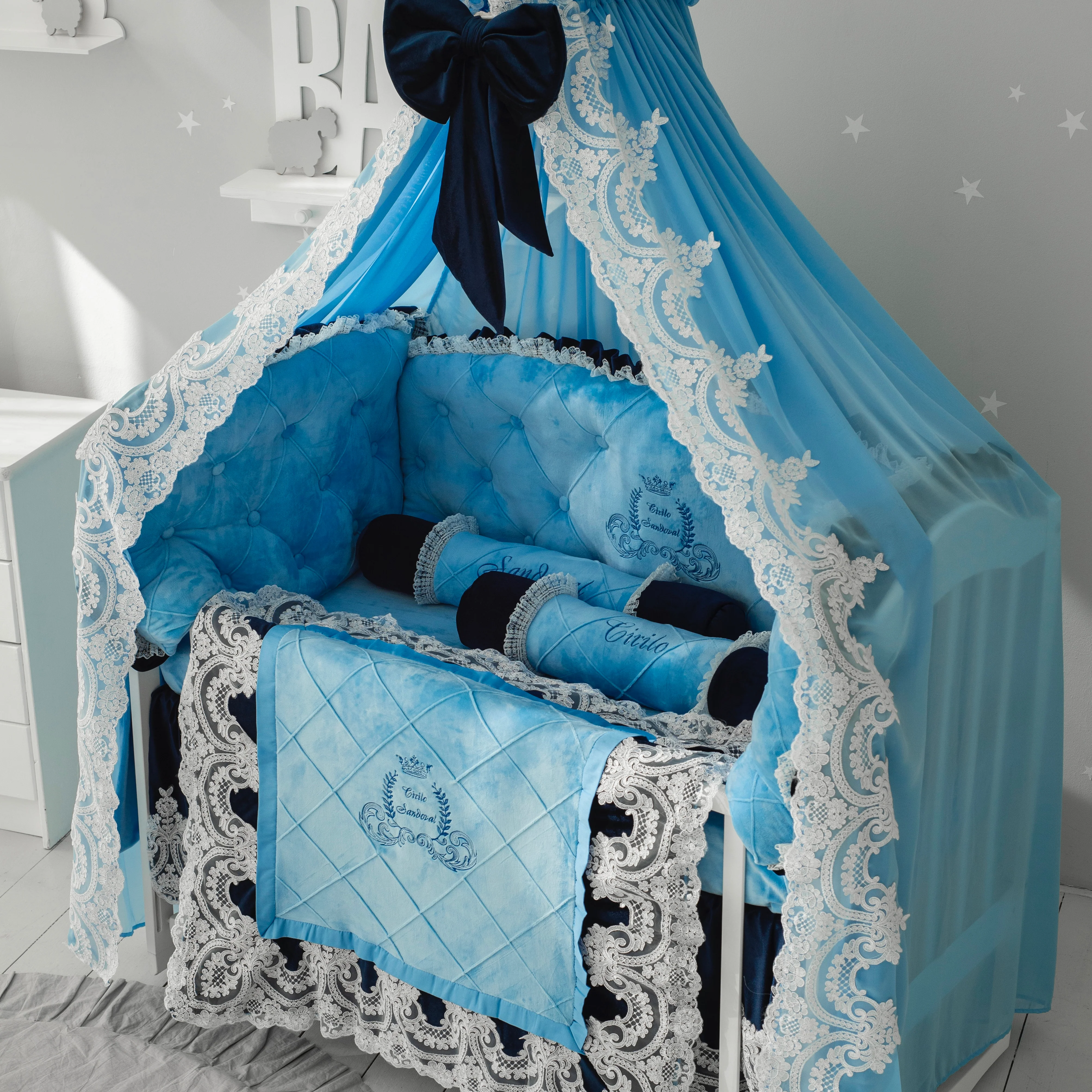Luxury Sky Blue Baby Boy Bedding Set with Lace Embroidery