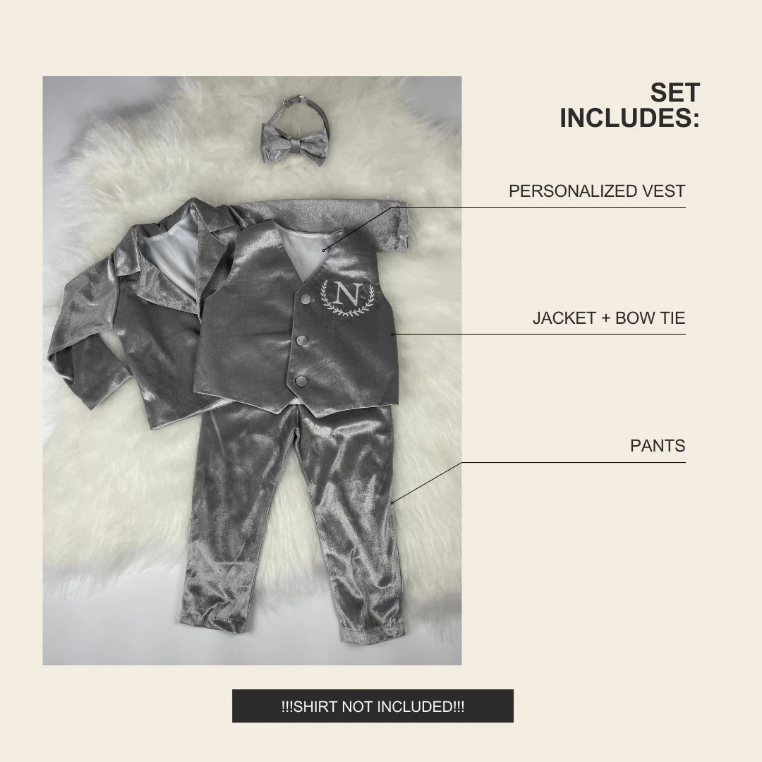Dress your little prince in style with this personalized baby boy suit. Crafted with the utmost care and attention to detail, this high-quality outfit is perfect for formal occasions and special events. The suit features a silver grey velvet jacket that adds a touch of elegance and sophistication. The set includes four pieces: a jacket, trousers, vest, and bow tie.