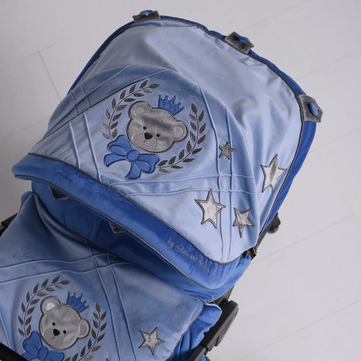 This personalized blue baby car seat cover set is a beautiful choice for parents who want comfort, coordination, and a gentle decorative theme for their baby’s travel essentials.