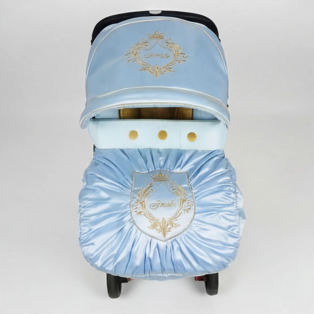 Give your baby’s car seat a refined and elegant look with this light blue baby car seat cover set, finished with delicate gold embroidery. The design combines a soft pastel palette with classic decorative detailing, creating a timeless style suitable for everyday use and special occasions alike.