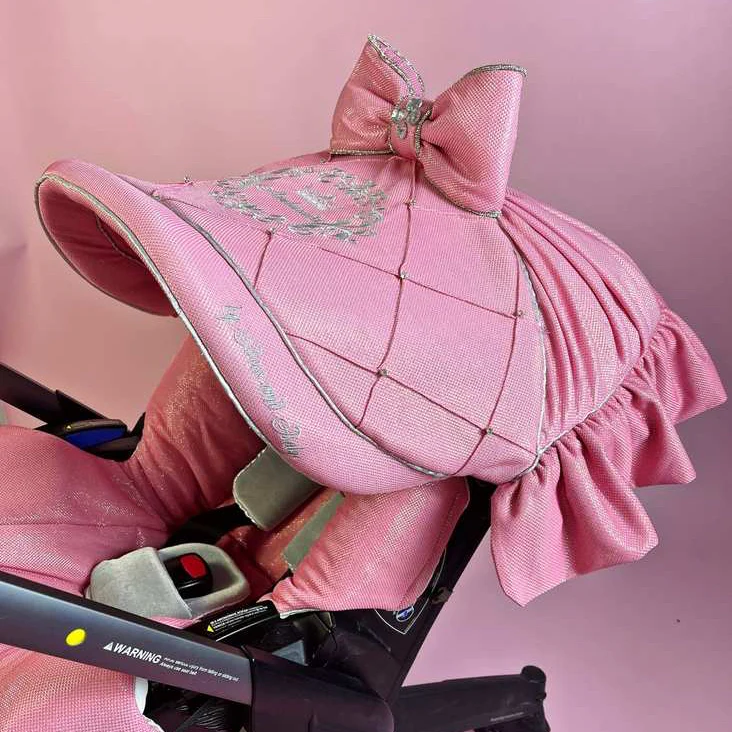 Sparkly pink baby car seat cover set with rhinestones, designed as a coordinated premium ensemble for parents who want a refined and elegant look. The Fairytale Princess design features soft quilted textures, decorative bows, and shimmering rhinestone accents.