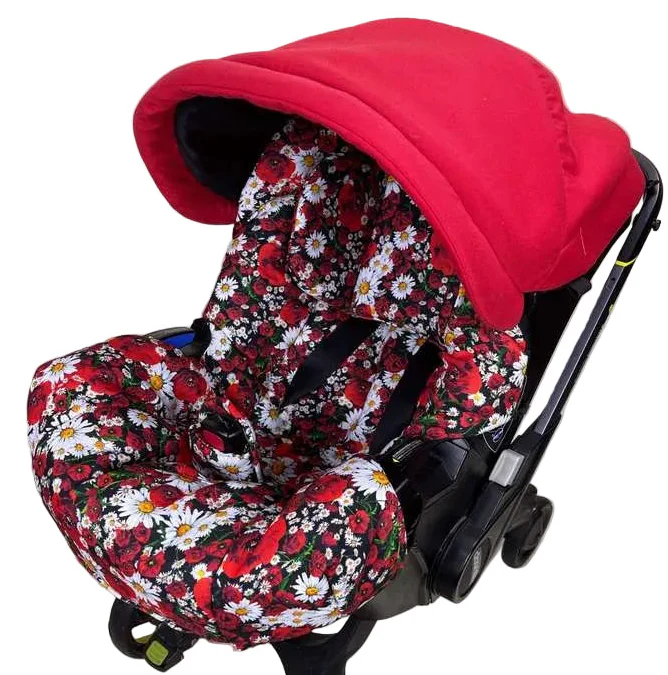 This red floral baby car seat cover set features a soft padded seat cover paired with a solid red canopy, creating a warm and charming look for everyday outings.