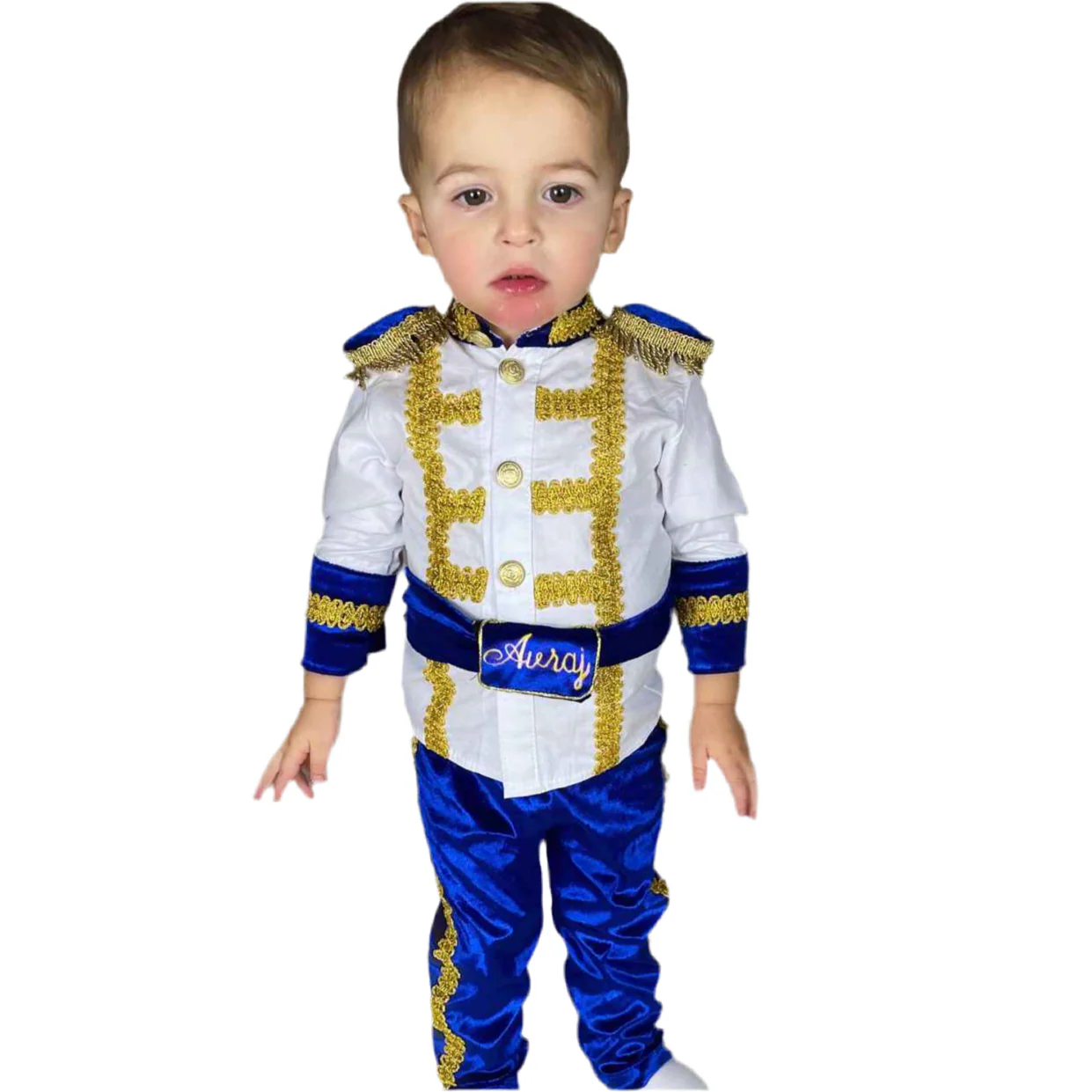 Make your little prince shine on his first birthday with our handmade Royal Blue Velvet Suit! This luxurious Prince Charming costume features elegant gold accents, perfect for a royal-themed celebration.
