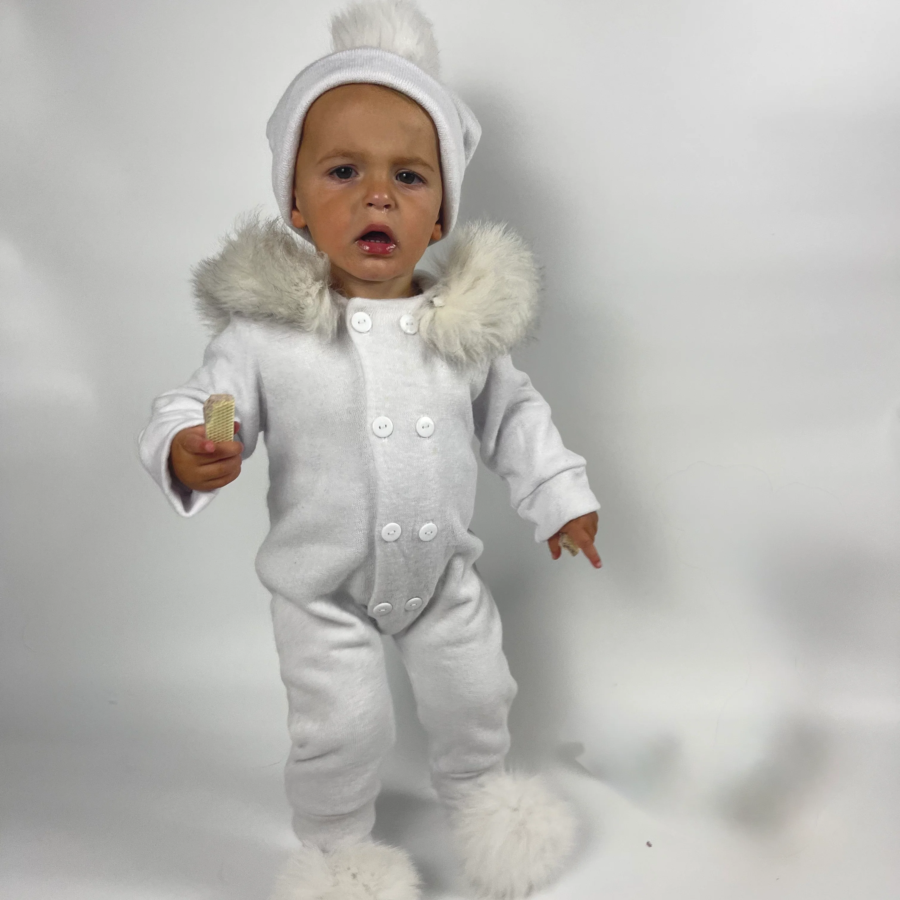 Elegant Snow-White Winter Baby Romper with Fur Hood